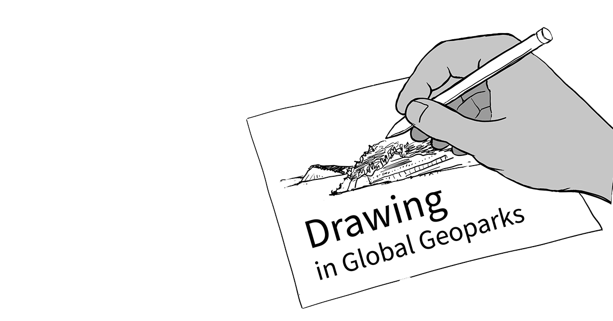 Drawing in Geoparks logo - an illustration of a hand holding a pen, drawing a landscape on a page.